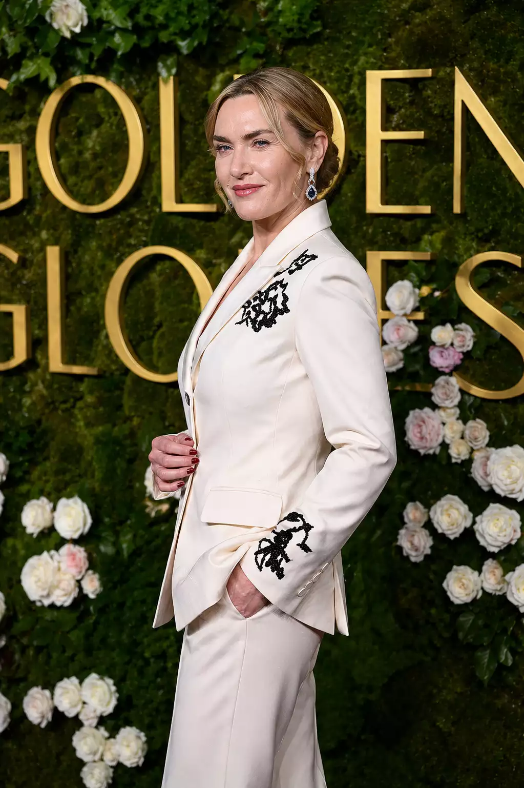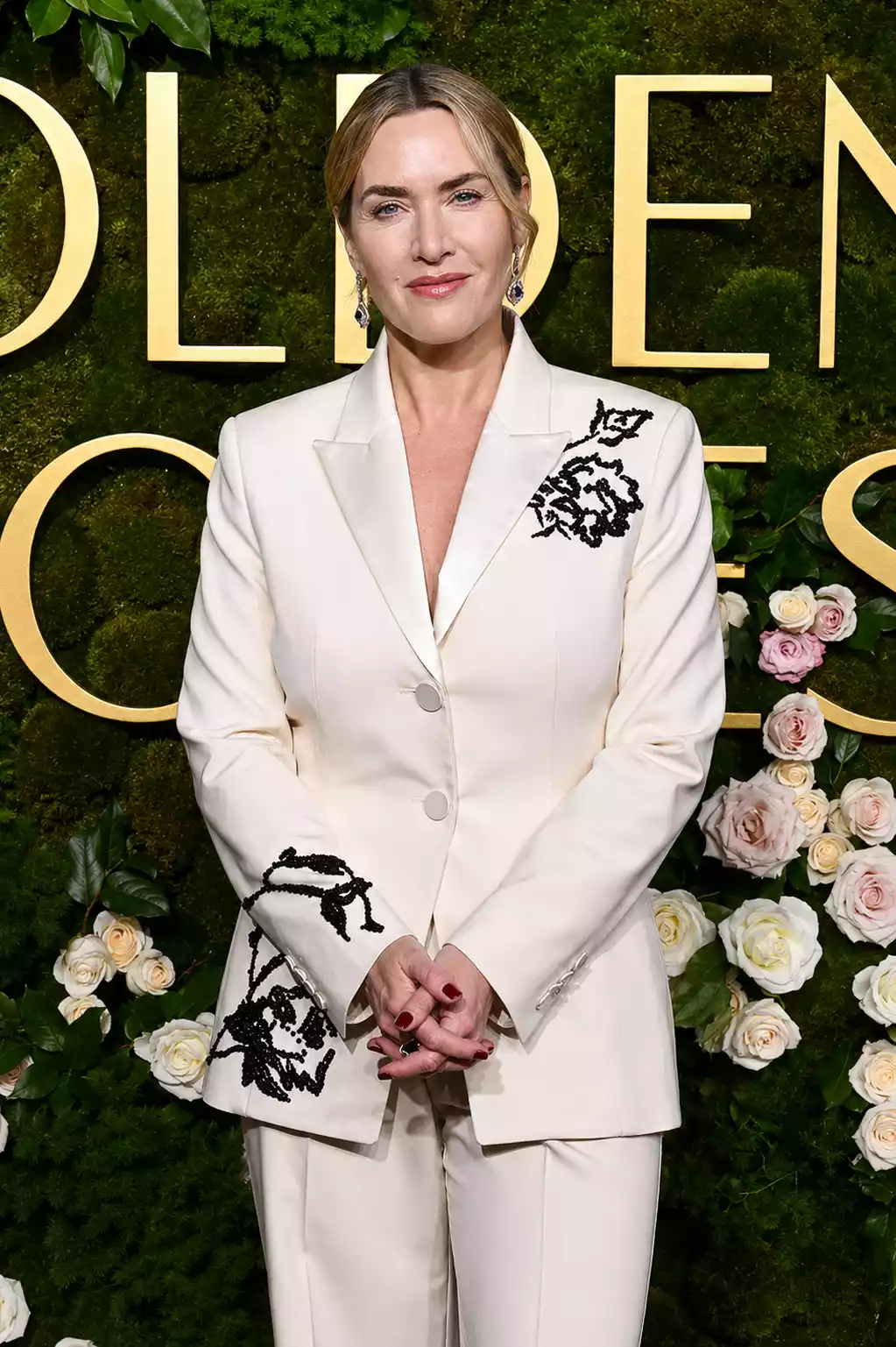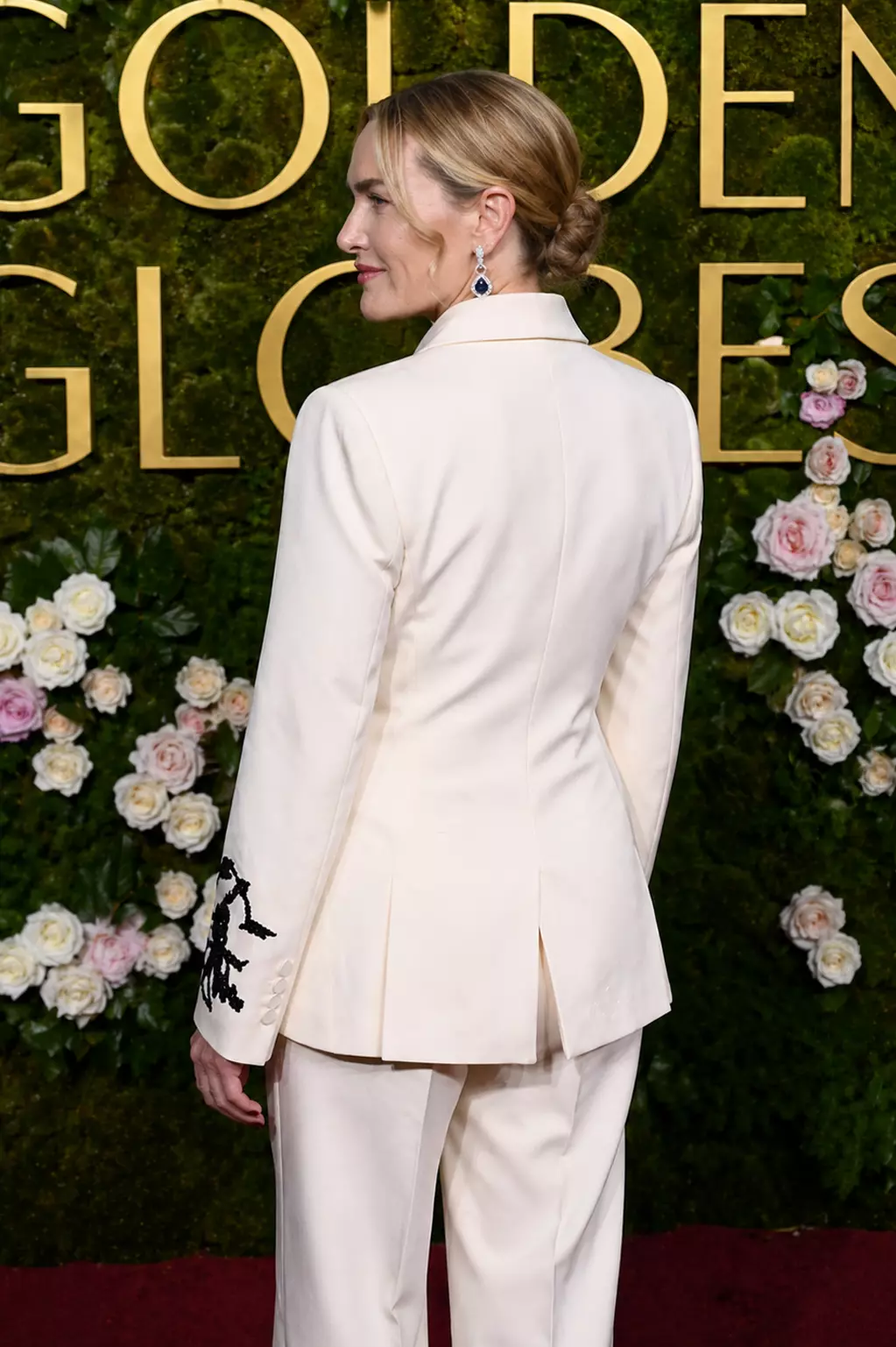 Kate Winslet Black and White Floral Suit – Elegant White Tuxedo Outfit for Women