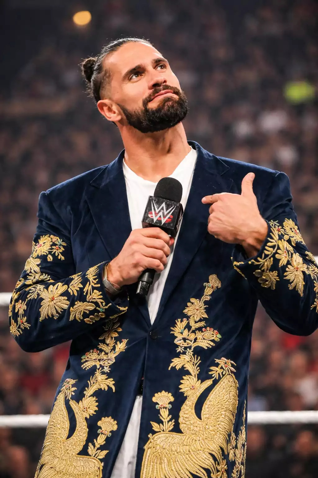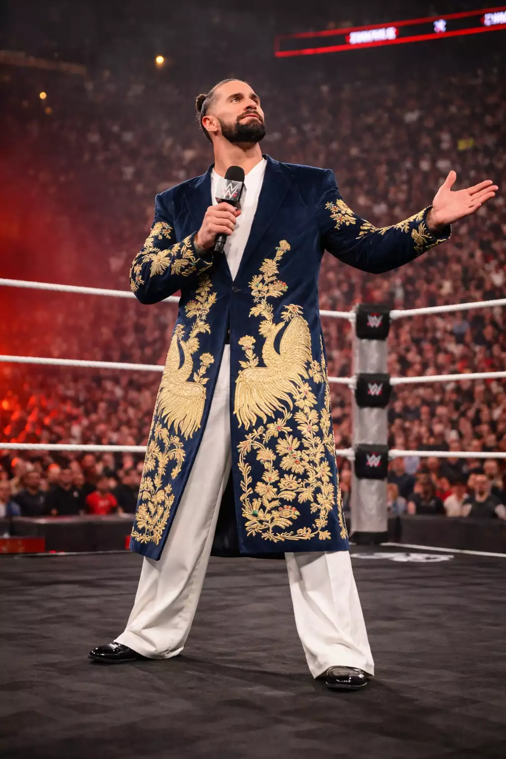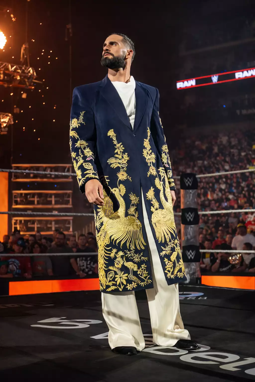 It is inspired by luxury couture and the famous Seth Rollins WWE RAW Golden Peacock Coat, known for its dramatic entrance appeal and artistic embroidery.