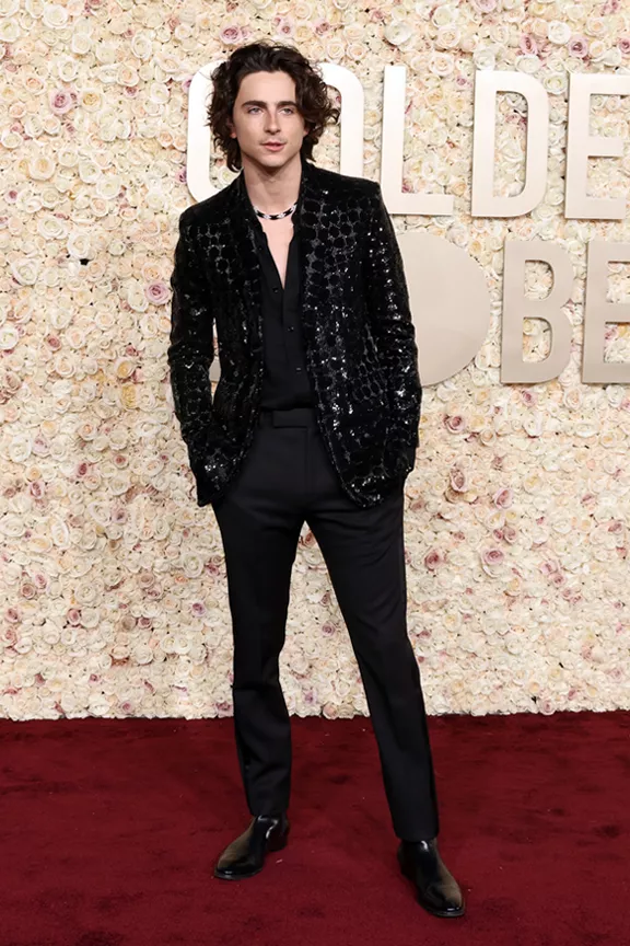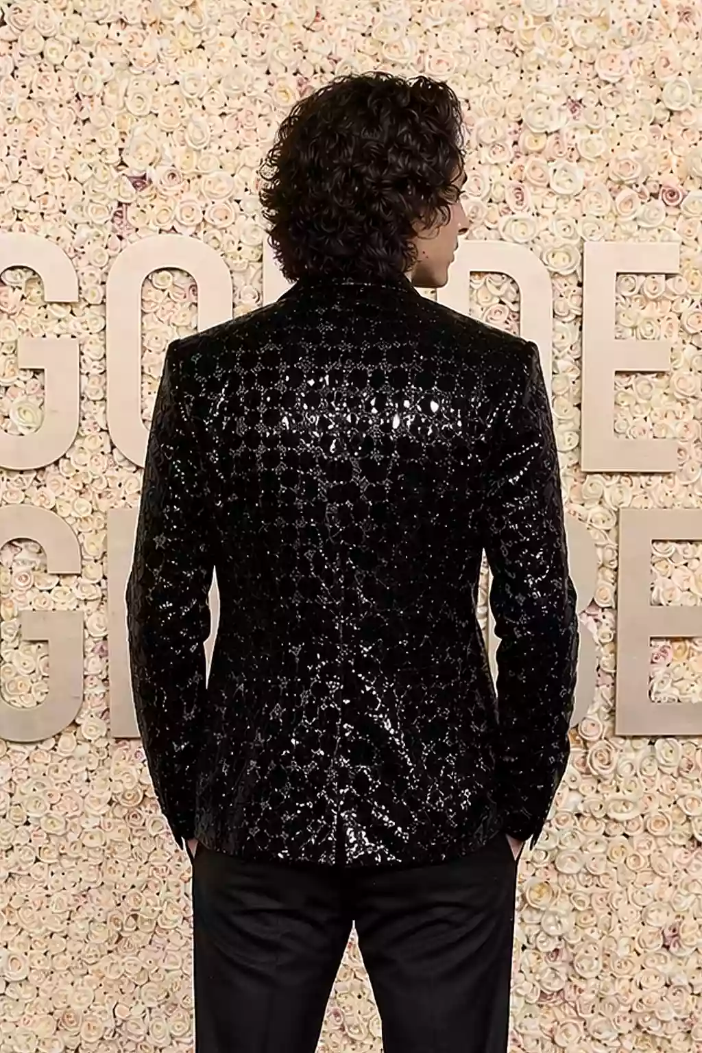 Pair this timothee chalamet black suit jacket with slim-fit trousers and Chelsea boots for a complete red carpet look. For a more relaxed yet refined vibe, wear it over a black shirt with minimal accessories. The sparkle does the talking keep the rest clean and sharp.