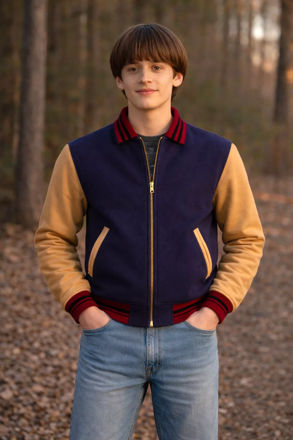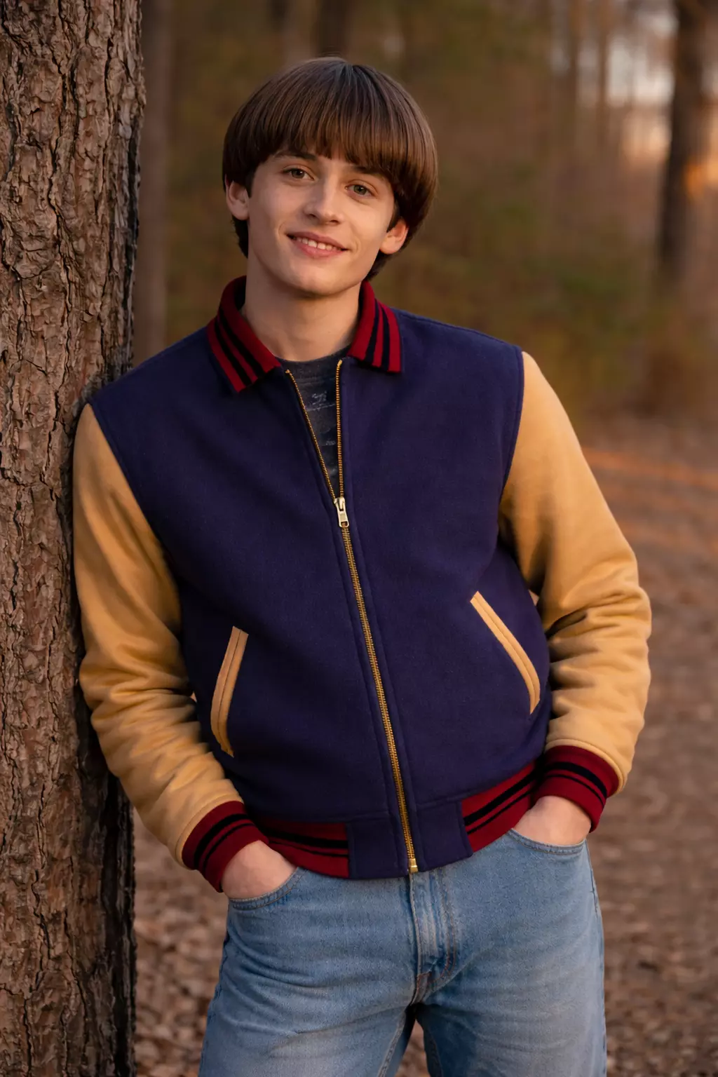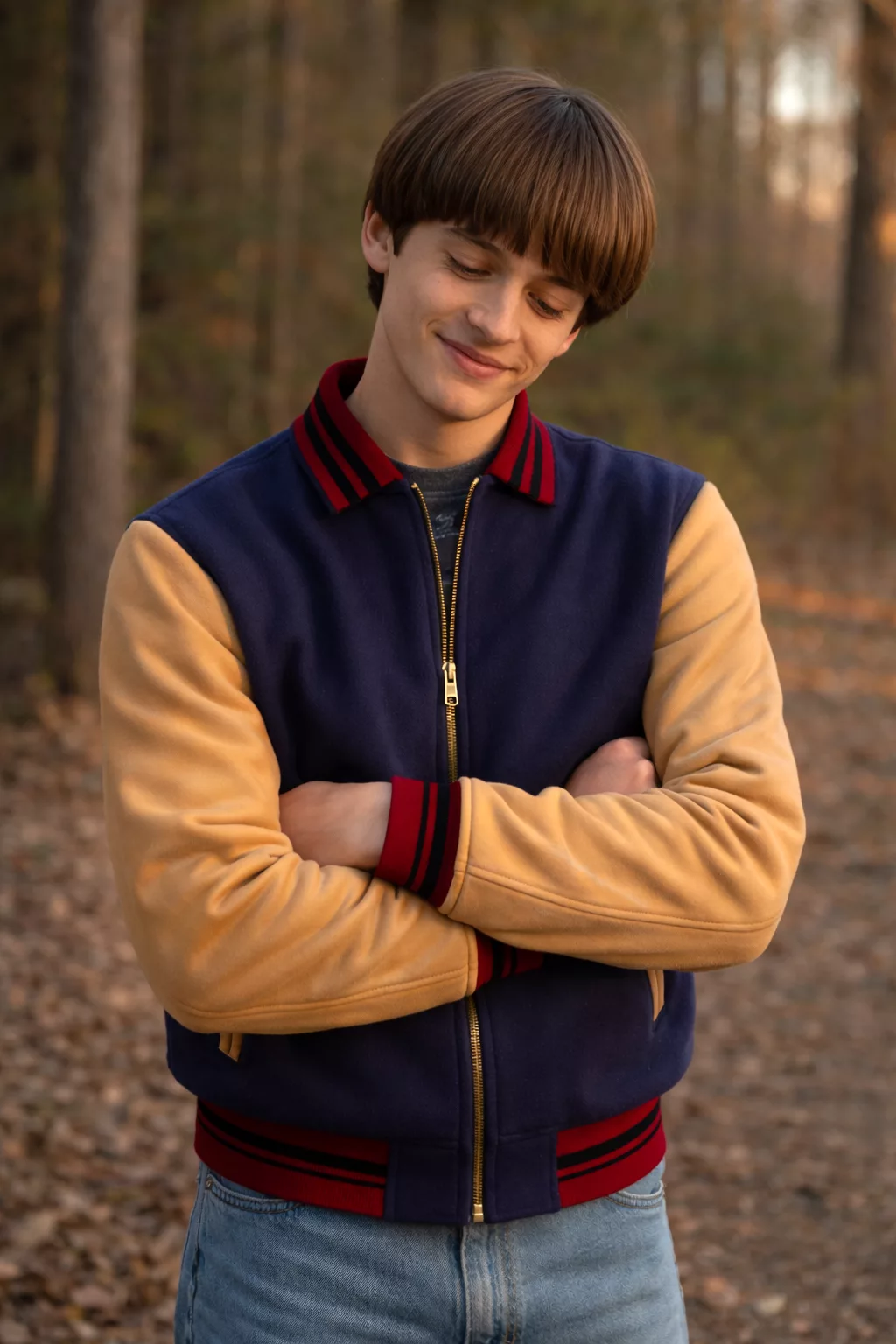 In Stranger Things Season 5, Will Byers regularly wears this retro varsity-inspired bomber jacket, symbolizing his character’s development and deeper emotional maturity.