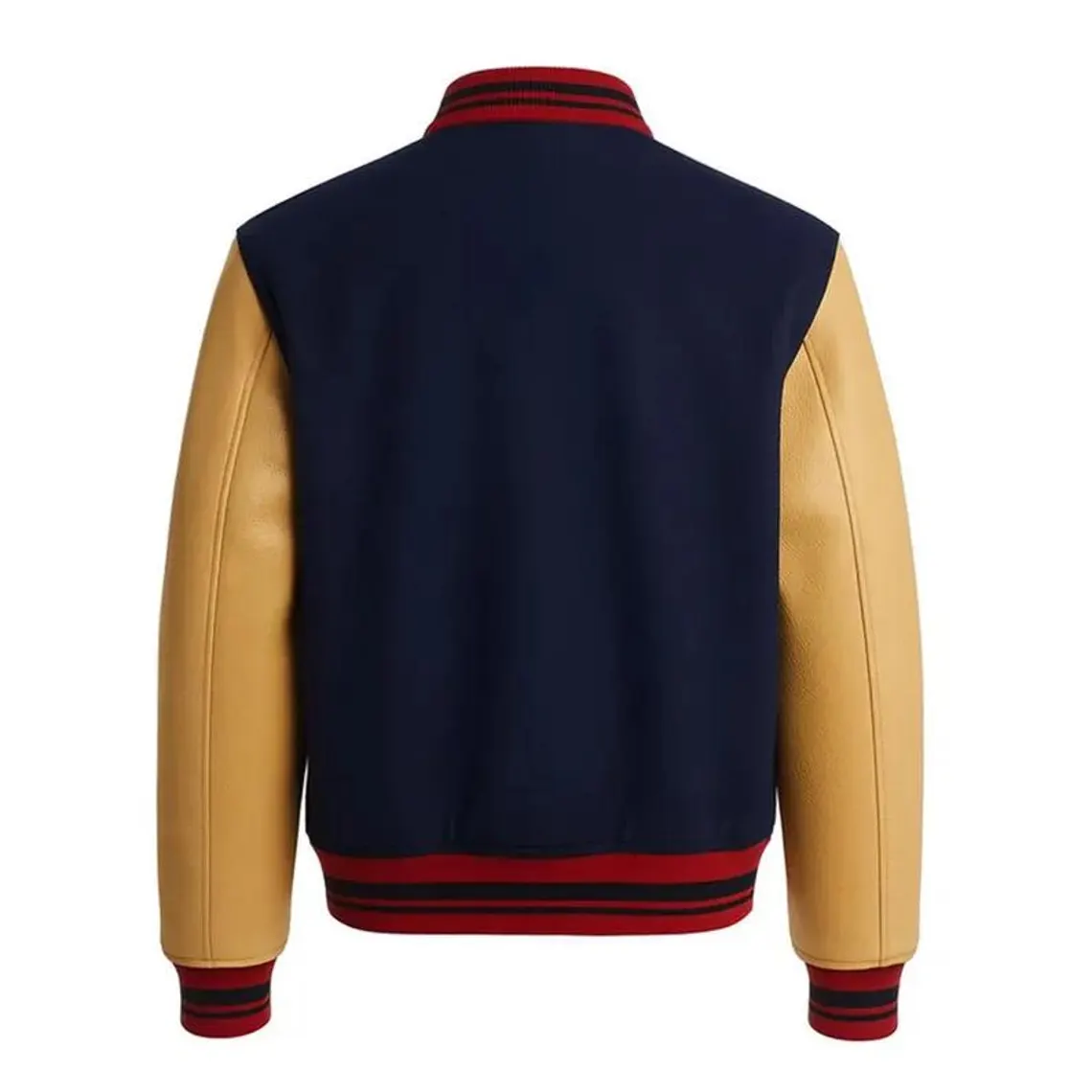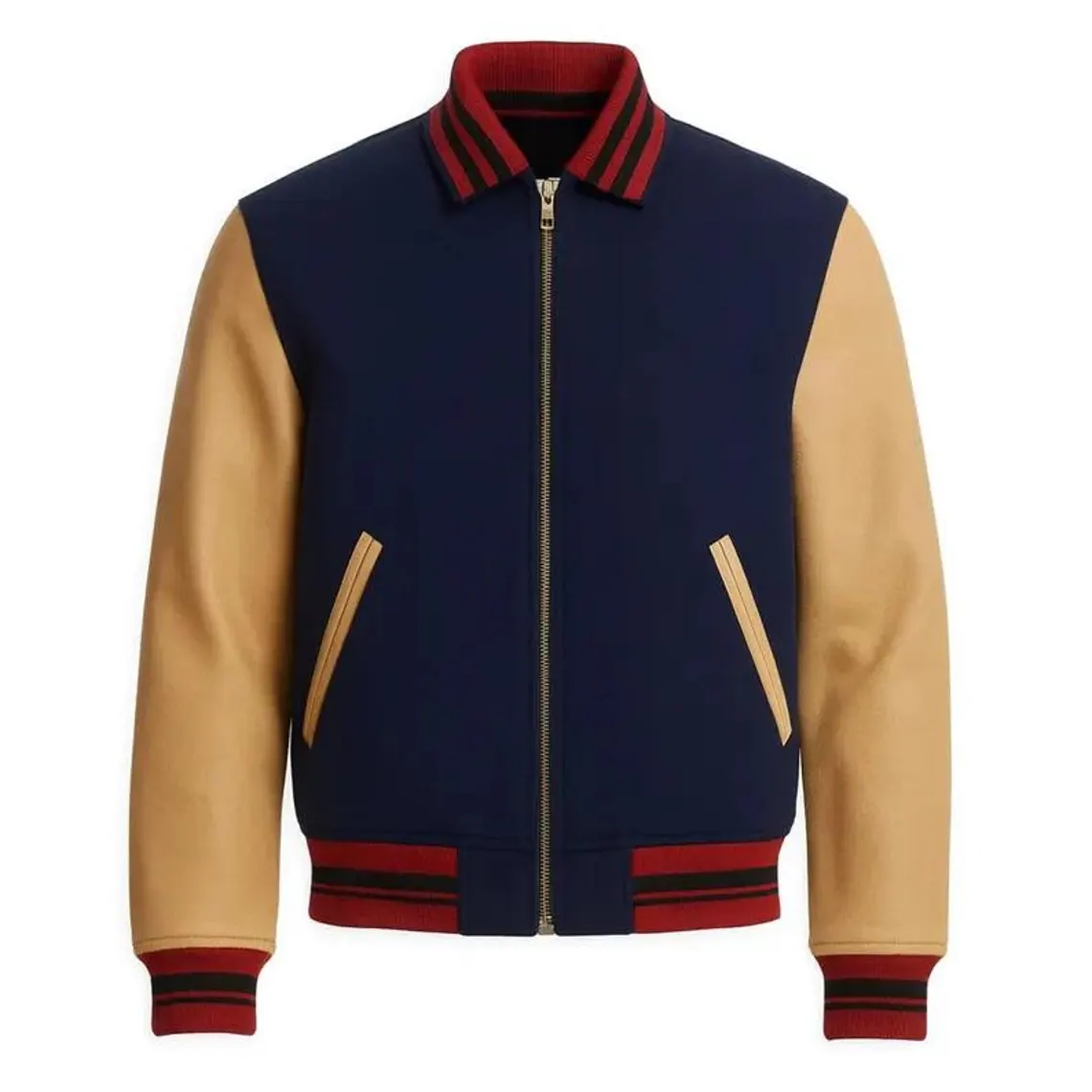 This men’s varsity jacket features a navy wool-blend body, contrasting tan sleeves, rib-knitted collar, cuffs, and hemline that retain shape while showcasing the authentic varsity style. The secure front zipper closure makes it practical and distinguishes it from traditional button-style designs typically seen in a varsity letterman jacket. With soft inner lining and quality stitching, this wool varsity jacket is suitable for casual outings, comic cons, winter layering, and fan collections.