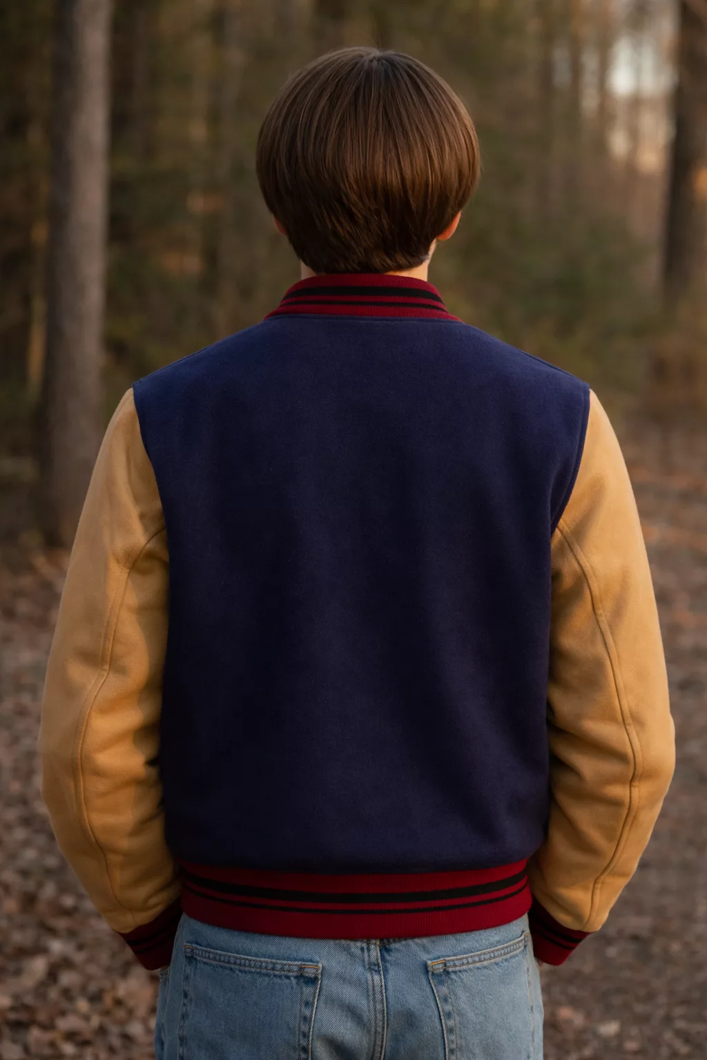 Fans looking for a Will Byers varsity jacket replica will appreciate its classic color blocking and screen-inspired detailing. Whether styled as casual streetwear or used as a TV series outfit jacket, this piece delivers accuracy and comfort. It also appeals to buyers searching for a varsity bomber jacket, as it carries the same sporty silhouette with a retro finish.