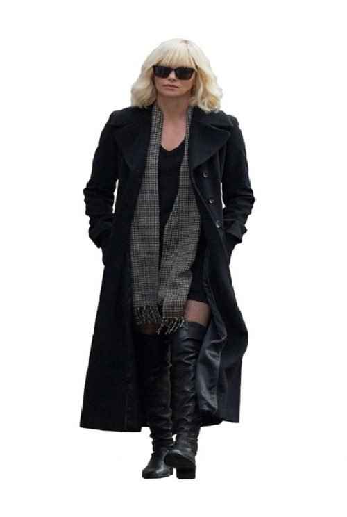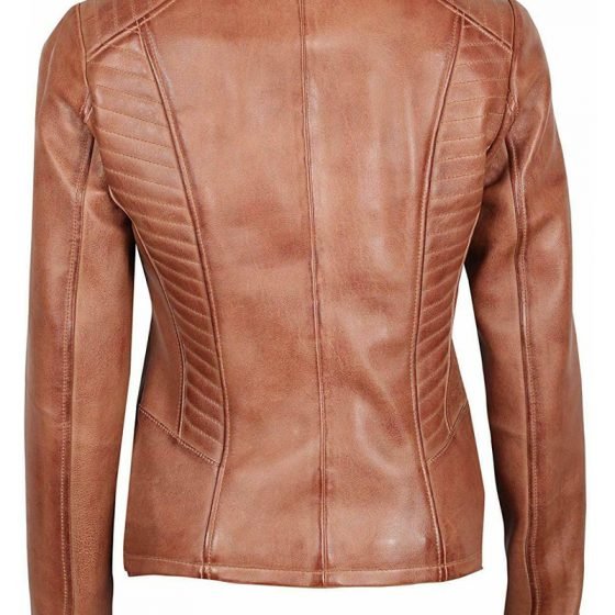- Front: Double-breasted button closure with lapel-like notched collar.